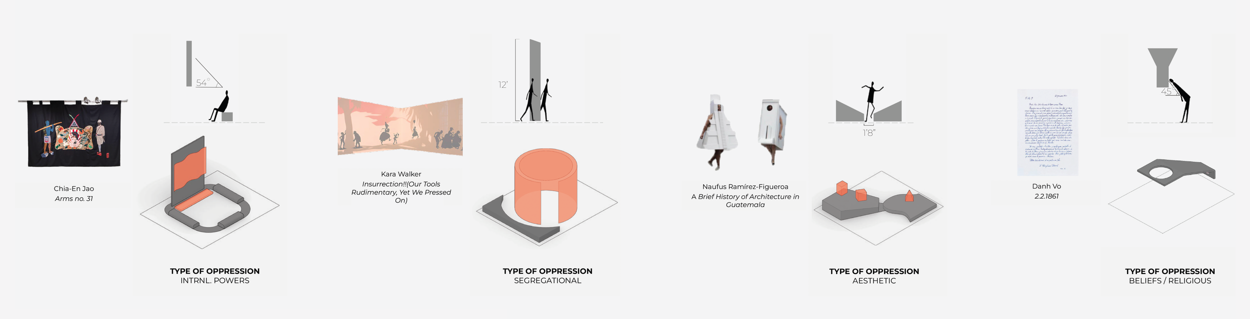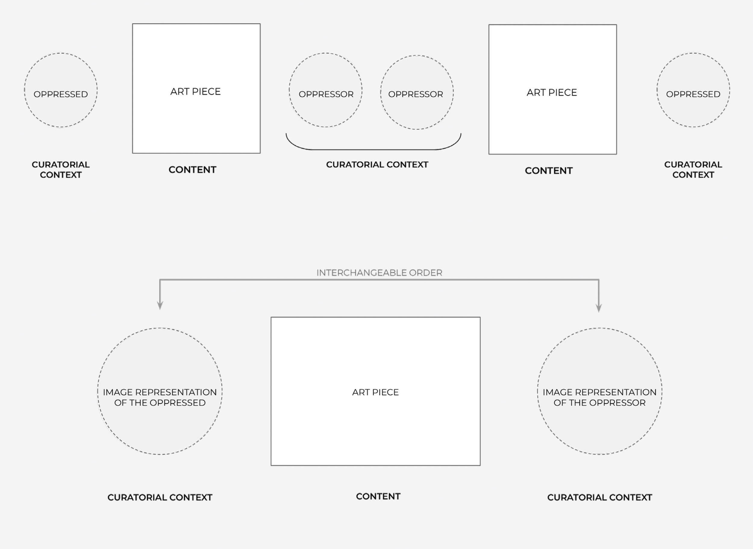 In the exhibition, each art piece has two pieces of context, where one is referencing who the art is showing as oppressed and the other the oppressor. These are represented visually through photographs or videos. The exhibition groups oppressed context and oppressor context which not only highlights how the curatorial narrative is creating connections between the pieces, it also creates a rhythm or pattern of the visitor experience. Additionally, we also studied different ways of how visitors will interact with the exhibition, oppressing the body into specific positions.